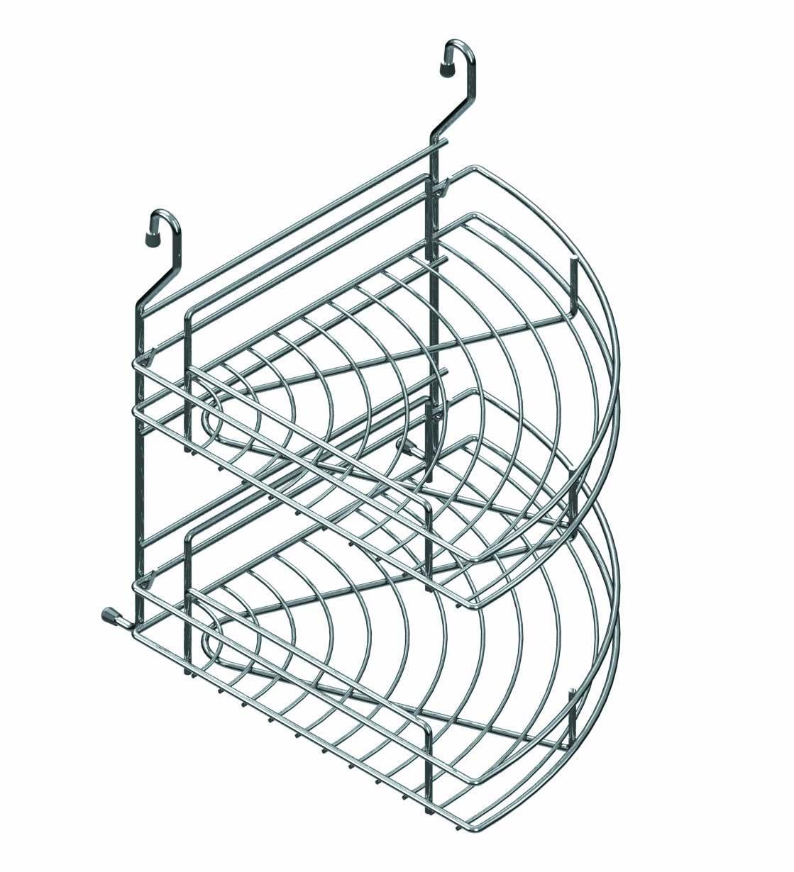 Mutfak askı borularında kullanılabilen krom renkte klasik iki raflı köşe sepeti